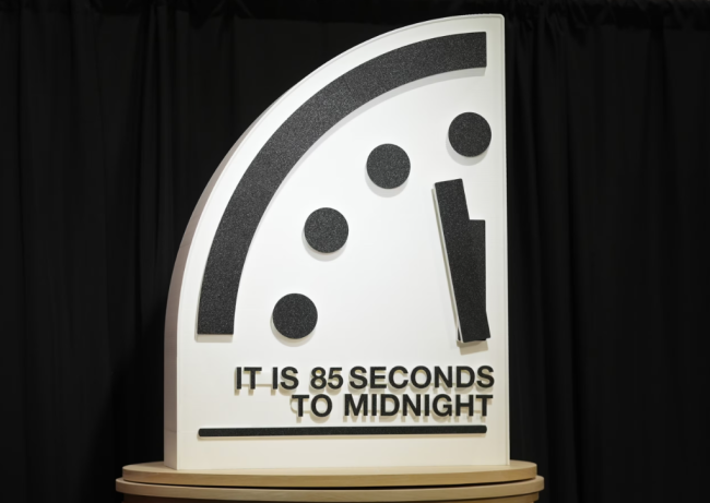 ABD’de bilim insanlarının "insanlığın yokoluşa ne kadar yaklaşmış olduğunu" göstermek için 1947’de oluşturduğu sembolik ‘Kıyamet Saati’, gece yarısına 85 saniye kala'ya ayarlandı. ABD Atom Bilimcileri Bülteni Bilim ve Güvenlik Kurulu, yıllık duyurunun yapıldığı canlı yayında Kıyamet Saati kadranını "00:00’a 85 saniye kala"ya ayarlayarak tarihindeki en ileri noktaya getirdi. Saat geçen yıl 89 saniyeye ayarlanmıştı. Yayında nükleer savaş, iklim değişikliği, biyoteknolojinin kötüye kullanılması olasılığı ve yeterli denetim olmadan yapay zekânın artan kullanımı gibi risklere dikkat çekildi. (Diken)