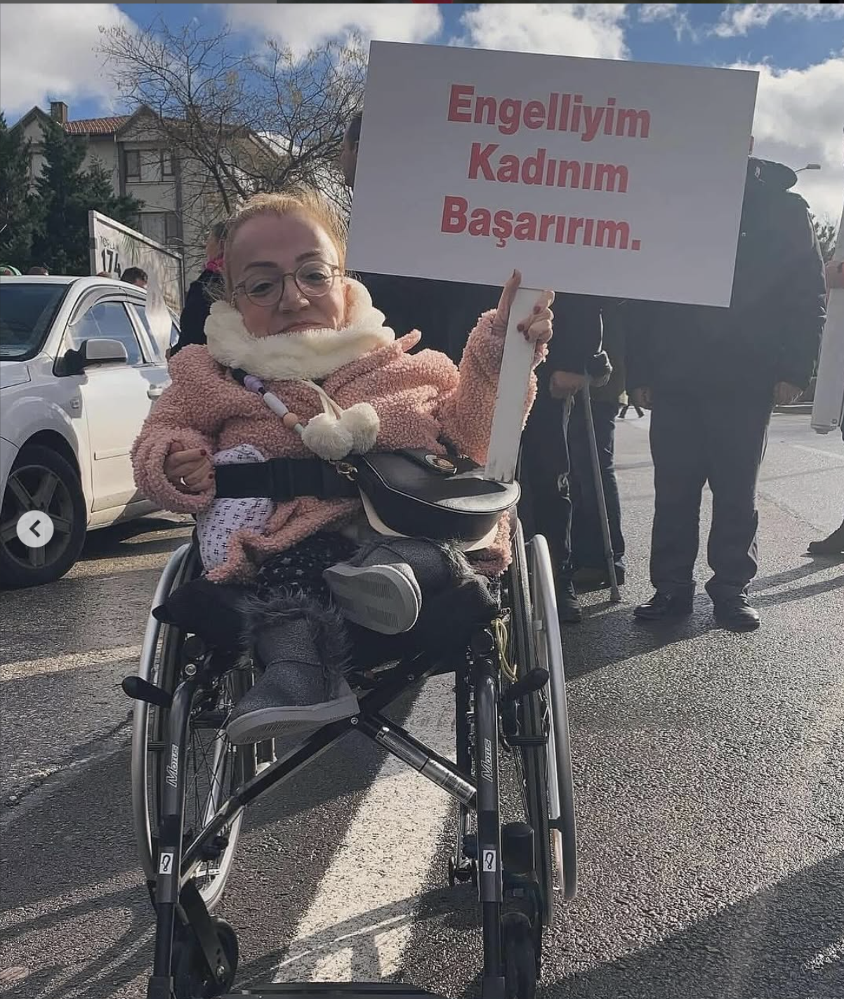 E.G.B.: Evet yani kat kat giyinmiş halde bile gerçekten çok soğuk bir gündü ve dövizi taşırken ellerim uyuşmaya başlamıştı soğuktan. Sağolsun arkadaşlarım, engelli kadın aktivistlerini çok güzel betimleyebiliyorlar. Sağolsun Naki Yücel arkadaşım, kardeşim bana o gün dedi ki, “Abla sana öyle bir döviz vereceğim ki tam seni anlatan bir slogan”. Ben de “Öyle mi” derken, gittim ve elime bir tutuşturdu, “Abla bak, ne kadar çok yakıştı sana” dedi. Derken eylemin ön sırasına beni koydu. Ön sırada ben ve arkada birçok engelli arkadaşlarımız, dostlarımızla mücadele alanında yer aldık..