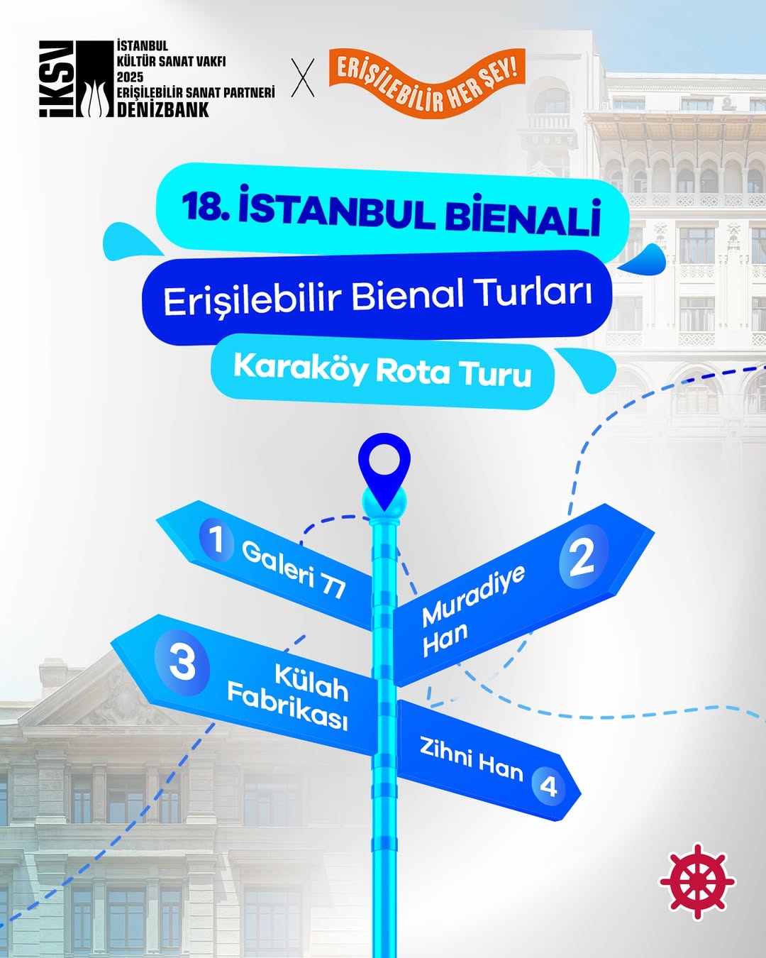Bu yaptığımız 10'ar adet turlardan dokuzar tanesi seçtiğimiz iki mekanda gerçekleşti; Galata Rum Okulu ve Zihni Han. Bienal'in diğer mekanlarına yayılmak hem düşündüğümüz bir şeydi, hem de en sağlıklı şekilde tırnak içinde nasıl çıkabileceğimizi düşündük bu yapılardan çünkü bu yapıların erişilebilirliği de ana konulardan bir tanesi. En rahat ulaşıma sahip olan ve yapıların içerisinde de hareket alanı en rahat olanları tercih ettik. Dokuzar tur dışarıda, birer tur da iki mekan arası birden çok mekanı gezdiğimiz turlardı.